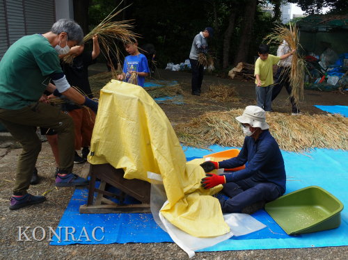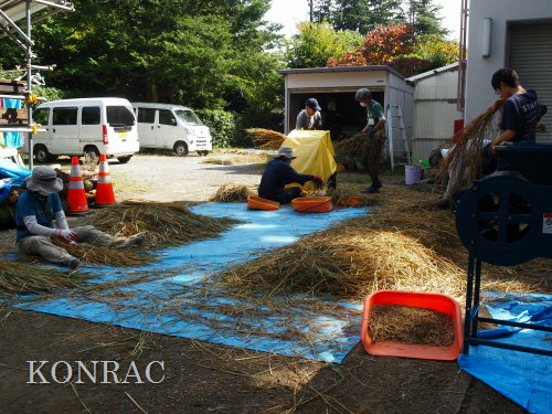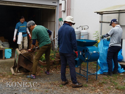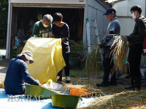 この脱穀のサポートは、数回経験してもらってから、伊澤に交代しました。 脱穀機によって脱穀されたモミなどは、北川が手箕(てみ)に集めてくれました。
