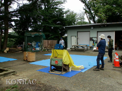 次に、脱穀を行うメインの場所にブルーシートを敷きました。 それから、足踏み式脱穀機と唐箕を出して、清掃し、給油してから、配置しました。