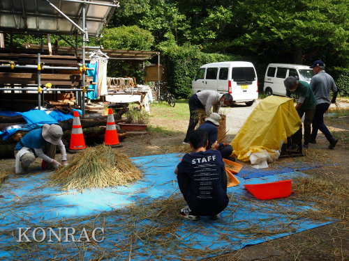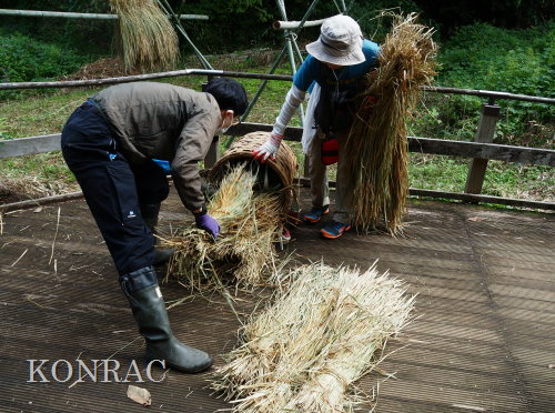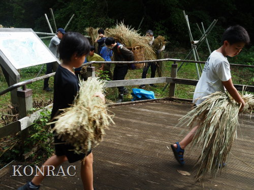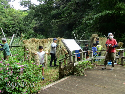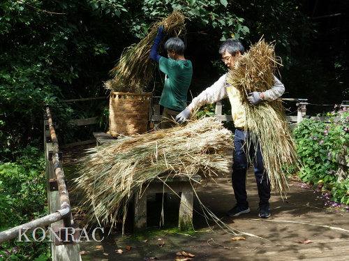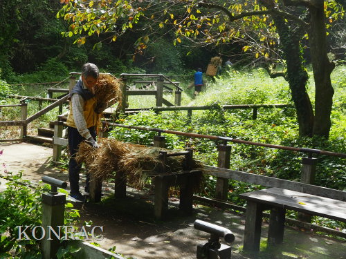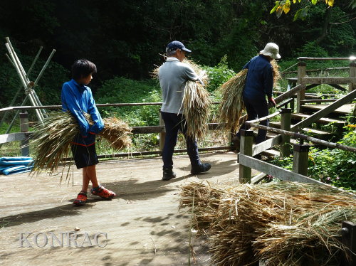 生田緑地整備事務所裏ヤードに、脱穀する稲束を運び終えました。