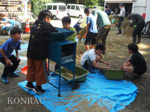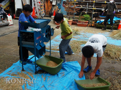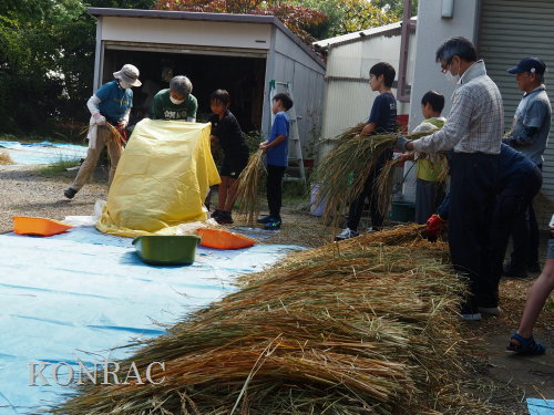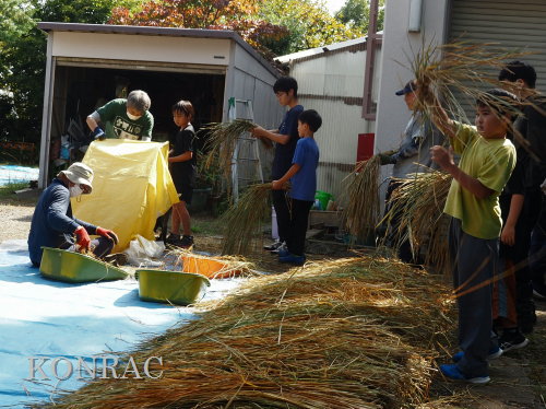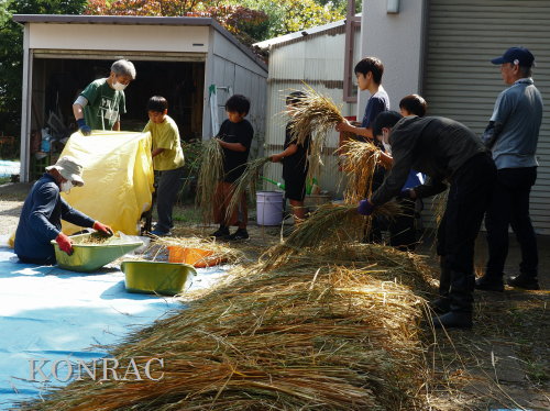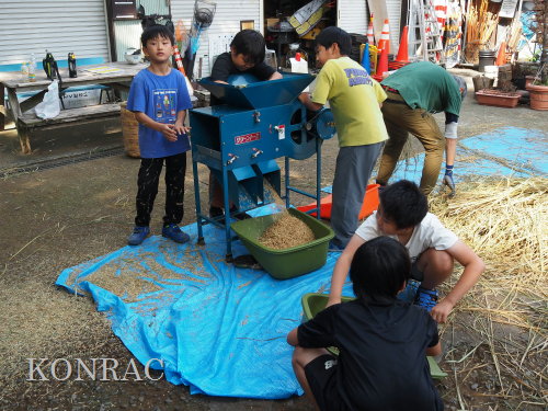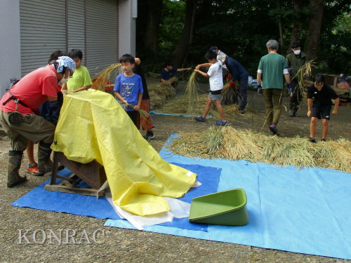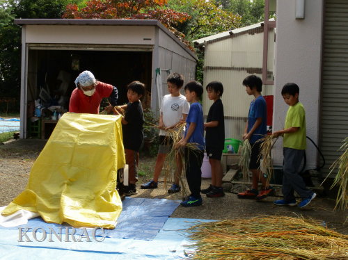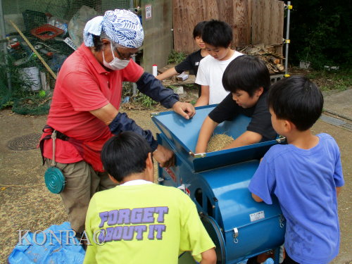 脱穀に用いた足踏み式脱穀機は、2004年にホタルの里に再生した田圃の元の地主さんからいただいたものです。 子どもたちの脱穀(イネコキ)については、初めのうちは、岩田が参加者一人一人の作業の面倒をみて行いました。