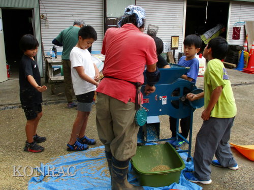 岩田は唐箕を使い始めました。 手回し式の唐箕ですが、子どもたちは、ハンドルを回すことを楽しんでいました。