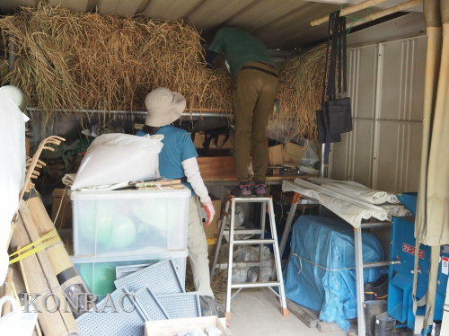 脱穀を済ませた稲束は、倉庫の奥にしまいました。
