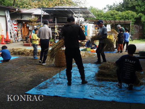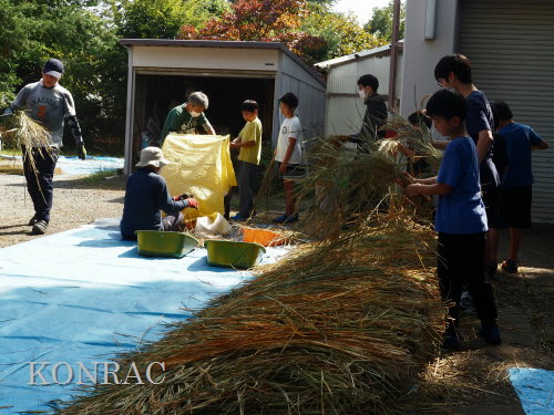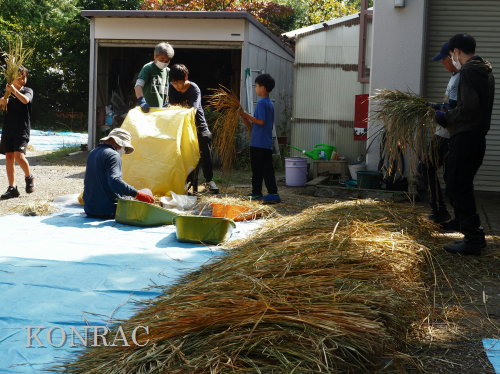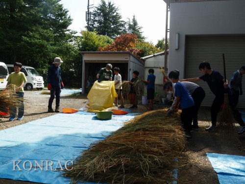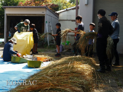 日時 2025年 10月 5日(日) 10:00〜15:00 晴後曇 場所 集合 市民活動室 活動 上の田圃、生田緑地整備事務所裏 参加(里山の自然学校 2年生)杉山智基、関山敢太、山崎晃汰 3名 (里山の自然学校 1年生)前場理宏、三重野寛、山室幹太 3名 卒業生サポーター 安達湊都 里山倶楽部応援 東陽一、北川英樹、野下智洋、吉澤正一 講師サポーター 伊澤高行、廣瀬朗子 講師・事務局 岩田臣生 合計 14 名 第8回の里山の自然学校は、脱穀です。 サポーターの皆さんは、9:00〜9:30に集まってくれて、準備を始めてくれました。 生田緑地整備事務所裏のヤードで脱穀を行います。 まず、整備事務所から竹箒を借りて、クヌギのドングリや、石ころを竹箒で掃き捨てました。