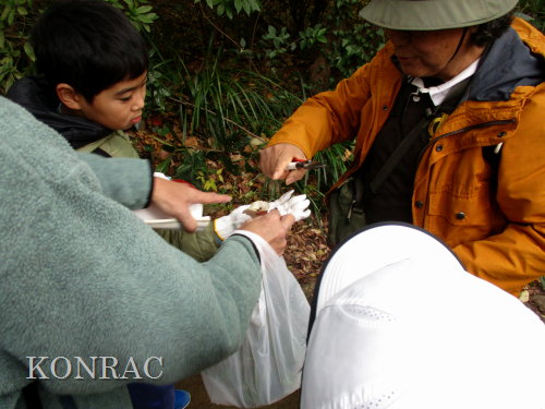 生田緑地整備事務所付近の中央園路で、キボシアシナガバチの空巣を採取した子がいました。