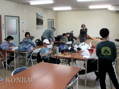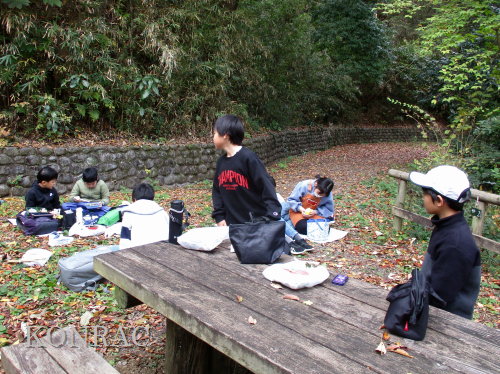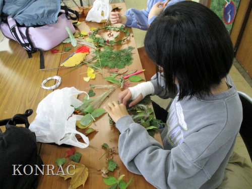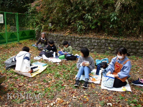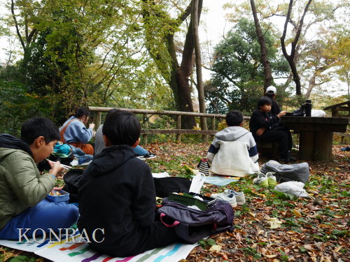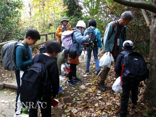 日時 2025年 11月 23日(日) 10:00〜15:00 曇 場所 集合 市民活動室 活動 活動図 参加(里山の自然学校 2年生)関山敢太、峰和菜子 2名 (里山の自然学校 1年生)數納太一、前場理宏、三重野寛、村田乙峰、山室幹太 5名 卒業生サポーター 安達湊都 講師サポーター 伊澤高行、廣瀬朗子 講師・事務局 岩田臣生 合計 11 名 第10回里山の自然学校<秋の里山>は、秋の生田緑地の自然を観察して歩いて、落葉や木の実など、里山の宝物を拾ってきて、リースなどをつくることにしました。 市民活動室に集合して、直ぐに外に出ました。