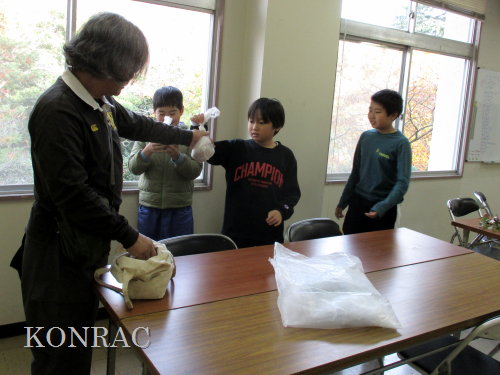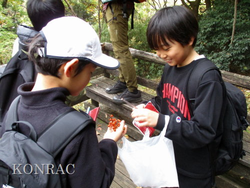 クロウメモドキ科のケンポナシの実が沢山落ちていました。 先端の丸いのが種子で、その手前は果柄が肥厚した果梗(かこう)で、非常に甘く熟していました。 残念ながら、試食しようという子はいませんでした。