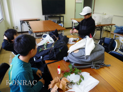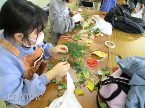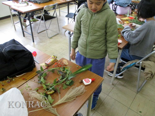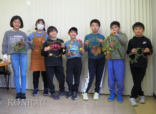 全員のリースづくりが終わったので、各自の作品を持って、集合写真を撮りました。