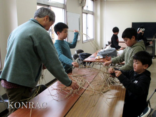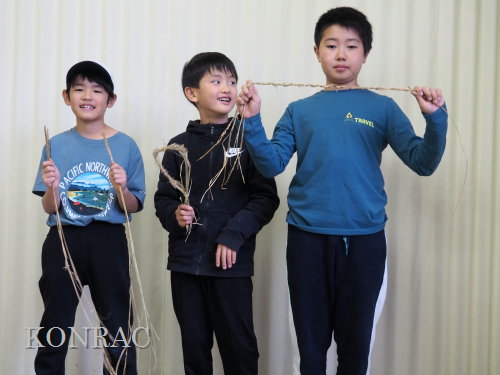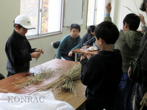 リースづくりが終わったら、希望者には、イネワラを使って、縄の綯い方の基本を教えました。