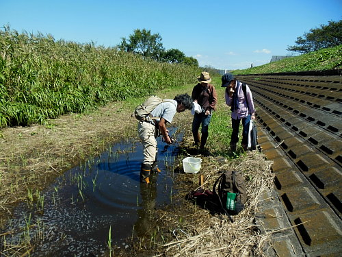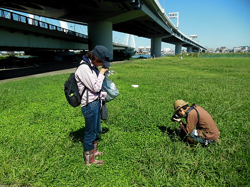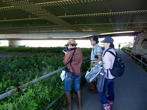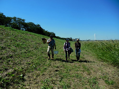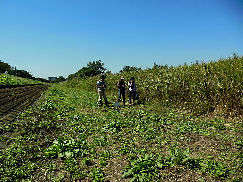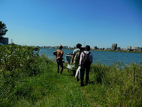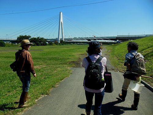 連携調査 日時 2013/9/27(金) 9:50〜13:00 晴 場所 川崎区大師河原 (大師河原水辺の楽校) 参加者 大師河原水辺の楽校(佐川麻里子)、岩田臣生、岩田芳美、佐藤登喜子 大師河原調査の第2回目です。 大師河原水辺の楽校の事務局をされている佐川麻里子さんが、今回も、ご同行くださいました。