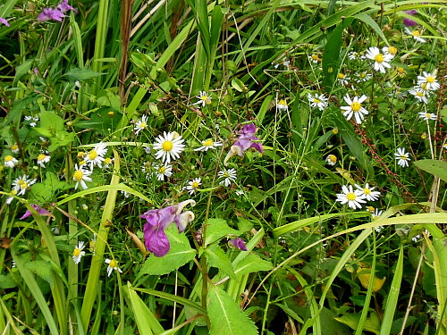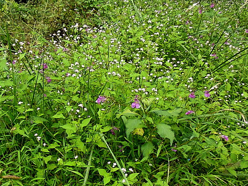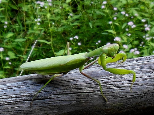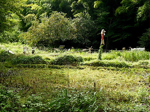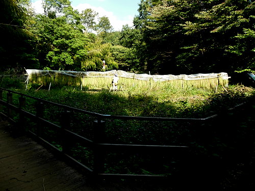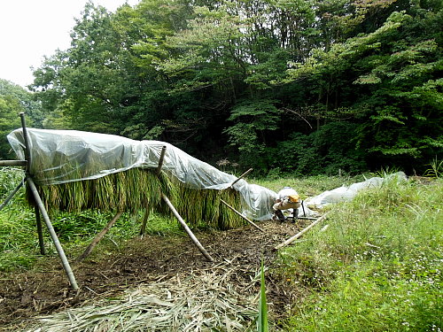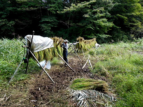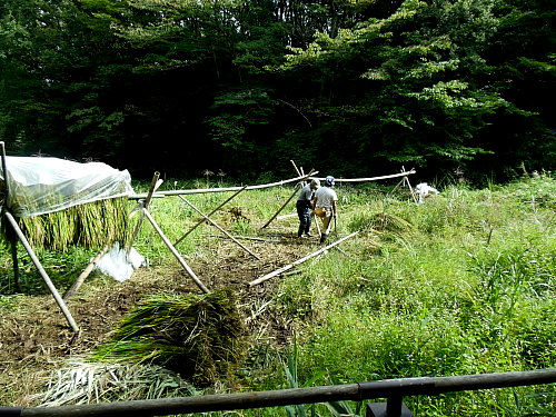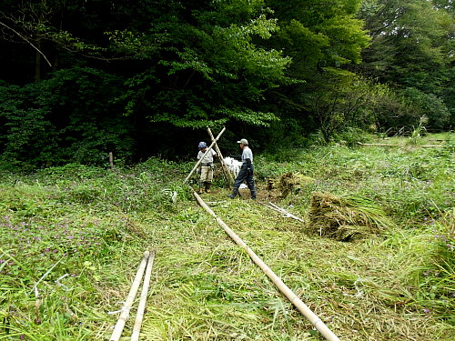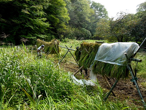 | 倒れたオダの立て直し 日時 2013/10/7(月) 11:00〜13:00 晴 場所 生田緑地 上の田圃 参加者 岩田臣生、岩田芳美、鈴木潤三 鈴木さんから「今朝、生田緑地に行った際、オダにつるした稲が全て落下、倒壊しているのを見ました。」というメールを頂戴し、急遽、生田緑地に向かいました。 オダは、昨日、新たに竹を伐って、追加した部分を残して潰れていました。             潰れた原因を調べずに組み立てても、また潰れることになると思います。 オダは倒れたのではなく、真下に潰れていました。 原因はオダの横の竿が稲の重さで撓み、支柱を押し倒しかけたところで外れて、真下に落ちたものと推察しました。 そこで、竿のかけしろを増やし、更に竿の途中の支柱を増やしました。竿の細い方が撓まないようにと考えました。         オダの立て直しが完了しました。 稲は1日で大分軽くなっていました。 ハラビロカマキリが目立つ季節になりました。   |