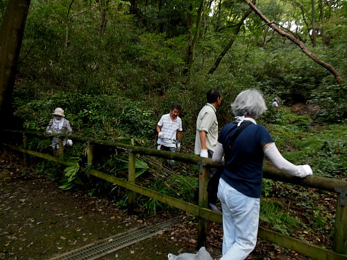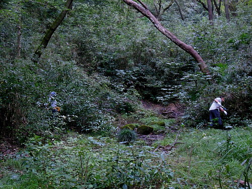 | ヤツデ、アズマネザサなどの除伐 日時 2013/10/8(火) 13:30〜14:30 晴 場所 生田緑地 参加者 岩田臣生、野鳥班(上原、大森、佐野、下條、瀧、中村、平賀、水田、森) 野鳥班が科学館裏谷戸のアズマネザサやヤツデを除伐したいというので一緒に作業することを決めていました。 ただ、諸事情から10月8日まで待ってもらっていました。 そしたら、誰かは不明ですが、湿地に入って、ヤツデなどを伐ったり、水流に止まり木を立てたり、勝手な管理がされてしまいました。 野鳥班はカンカンですが、マナーの悪い野鳥ファンの仕業のようです。 最近、生田緑地の来園者が増えていますが、マナーの悪い来園者も増えているようです。 このように園路から林内に柵を乗り越えて入る野鳥ファンは野鳥を撮影することしか考えていません。 現地は、湿地のシラコスゲが踏み荒らされていました。 数年前に、北部公園事務所が柵をつくってくれた時に立ててくれた立入禁止の看板は消えていました。 誰かが抜き取ったのでしょう。 マナーの悪いバードウオッチャーは非常に悪質です。 野鳥班からこの報せが入った時に、直ちに立入禁止看板の設置を要請したので、看板は立てられていましたが、この湿地についての認識が無いために適切な看板になっていませんでした。 この湿地には氷河期の生き残りと言われている生物が生息しています。 これの保護を第一優先で考えてほしいと思います。           唐箕の組み立て 日時 2013/10/8(火) 12:30〜13:15、14:40〜15:30 曇 場所 生田緑地 生田緑地整備事務所裏の倉庫 参加者 岩田臣生 田圃活動を始めて9年目にして、やっと唐箕を購入しました。 14日の脱穀のために、これを組み立てました。 ただ、説明書は展開図が示してあるだけだったので、何度もやり直すことになり、時間がかかりました。   |