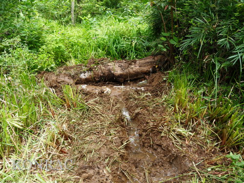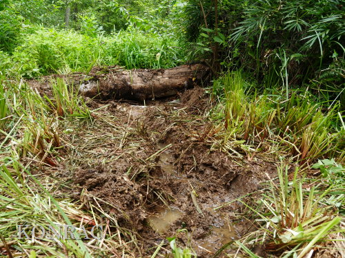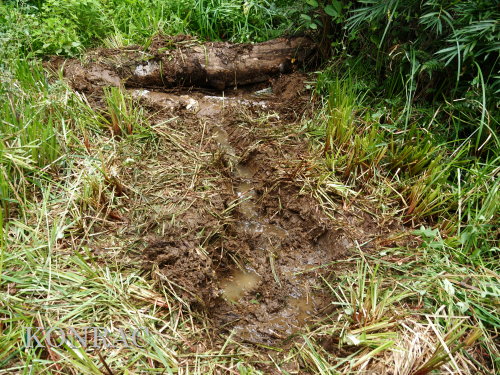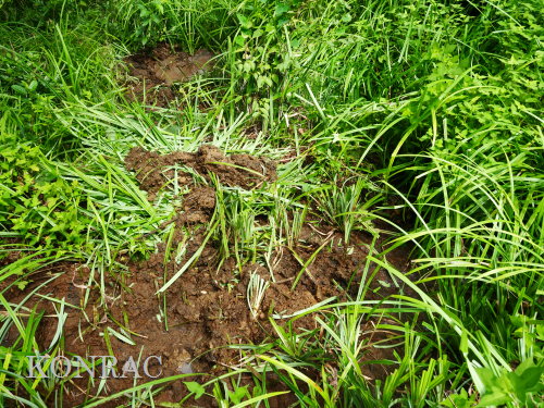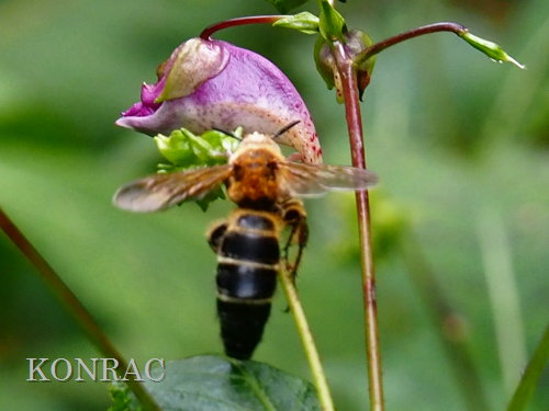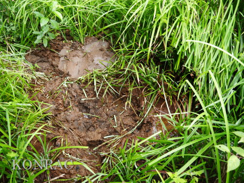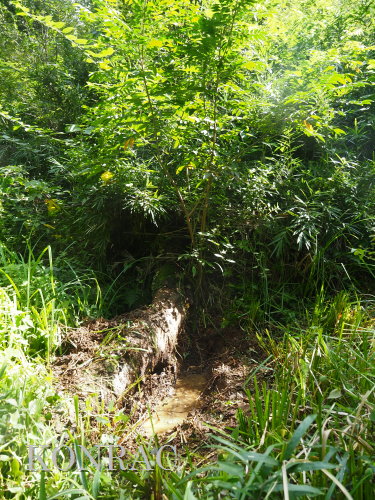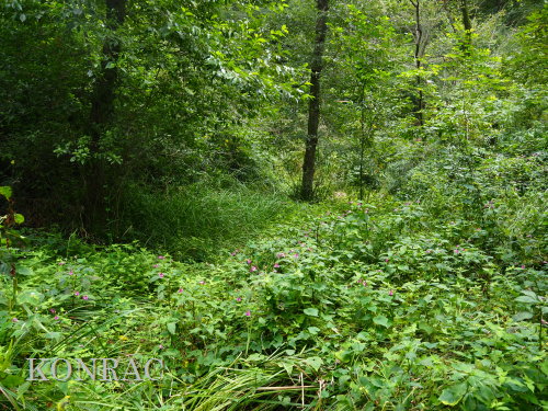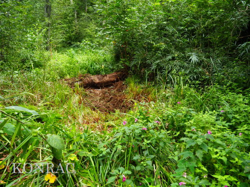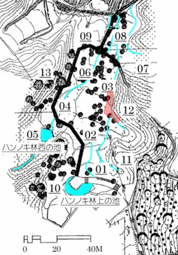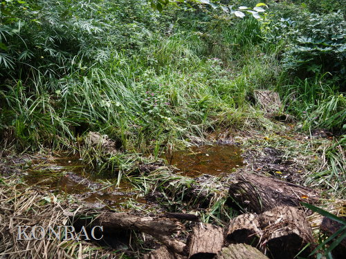 | 谷戸の水辺保全 日 時)9月23日(火) 9:00〜12:00 晴 場 所)生田緑地 ハンノキ林(A07-03) 活動者)岩田臣生 今朝は、青空にうろこ雲がゆっくり流れていました。 ハンノキ林東側地区(A07-12)の斜面下の水流の落枝ダムつくりを行うつもりで、ハンノキ林上の池付近から入って、ヤブ刈りをしながら、目的地に向かいました。 ハンノキ林には、ヤマホトトギス、ツルニンジン、ツリフネソウなどが咲いていました。       萌芽更新地区北側を源頭部とする谷に、9/13(土)に掘った穴には、水が溢れていました。 相変わらず、5〜6匹のオオスズメが出入りしていました。   9:33 暑さ指数 20.8℃、周囲温度 24.8℃、湿度 59.2% 伐採して倒してあったナラ枯れ大径木は、地面から少し浮いていましたが、川幅としては狭くなっている場所だと判断し、堰を設ける場所にしました。 まず、この材の際に溝を掘りました。 上の方は黄褐色の土で、その下が緑灰色の飯室層混じりの土でした。 斜面を見上げると、伐採しなかったオオモミジの大木がありました。     それから、その辺りのミヤマシラスゲを刈りました。 次に、水路になるように溝を掘って、掘った土砂を使って土嚢をつくりました。 水辺保全としての泥上げは毎年実施していたはずなのですが、何年も放置していたように、しまった土砂が堆積していました。 土嚢に使う土砂は、ここに溜まっていた土砂を使いました。   土嚢を4袋つくって、先程、材の際に掘った溝に並べました。 土砂を取るために掘った溝には、僅かずつですが、水が染み出していました。     ここから、先程確認した源頭部の水面までの間は、10m以上ありそうです。 土嚢堰の高さについては、この溝を広げて行って、水面が広がって、この土嚢を越水するようになってから考えることにします。   水流の水面が広がっていない原因が、降雨不足ばかりではなく、泥上げができていなかったことも大きいと分かったので、 辺りの水辺も少し調べて歩きました。 ナラ枯れや東側斜面の伐採更新によって、明るくなったことで、ミヤマシラスゲが繁茂してしまったため、泥上げも容易にできなくなっていたようです。     この日の活動を終了しようと思って、土嚢堰を見ましたが、水は殆ど増えていませんでした 今後の水辺保全については、ゆっくり考えたいと思います。   盛期を迎えたツリフネソウには、キンケハラナガツチバチ?が吸蜜に来ていました。   合流部には、ジョロウグモが巣を張っていました。   合流部のウメモドキの実が紅くなっていました。   |