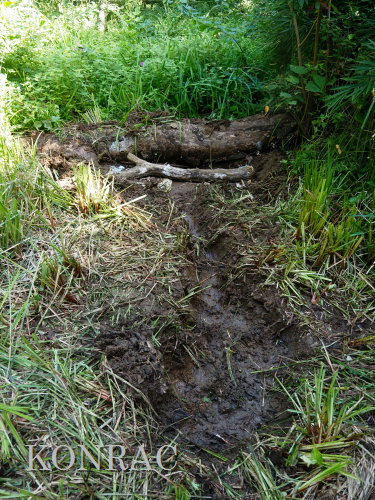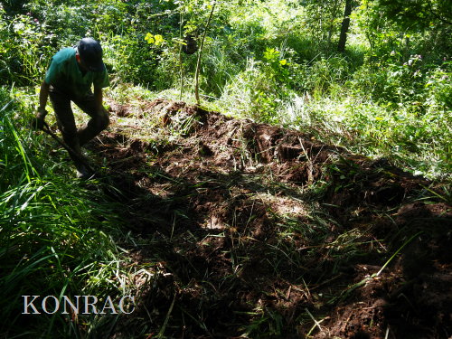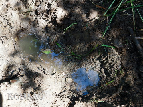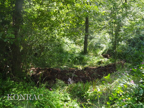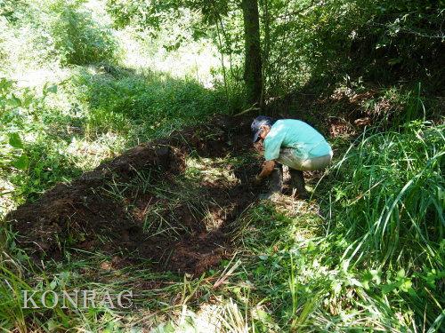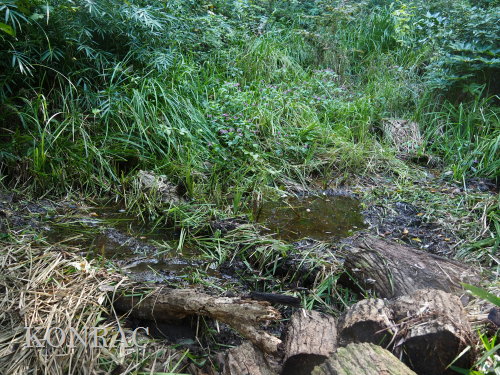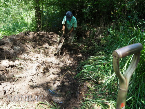 | ハンノキ林の水辺保全 日 時)9月25日(木) 9:00〜12:00 晴 場 所)生田緑地 ハンノキ林(A07-03) 活動者)岩田臣生、田村成美(10:00〜)   (上図)活動場所図(四角い水色の中に数字) 01 9/13(土)に活動 02 9/25(木)に活動 03 9/23(火)に活動 一昨日(9/23)の活動で、水溜まりづくりを試みた【03】は、残念ながら、染み出していた水が消えていました。 谷の水は、更に深い所を流れているのだと思いました。 もっと広く、深く泥上げしなければならないのだろうと思いました。   9/13(土)の里山倶楽部の時に掘った【01】には水面が広がっていて、 相変わらず、複数のオオスズメバチが吸水に来ていたので、水辺に入るのは躊躇われました。   この日は、【01】と【03】との中間に、水溜まりとなる穴を掘ることにしました。 ここ【02】は、右岸に、ハンノキの大木があり、左岸に小径木がありますので、これを目印にします。 また、源頭部の支谷戸の出入口に位置し、ハンノキ林(A07-01)からの小さな水流があった谷部に合流する場所に面しています。 そこで、この【01】、【02】、【03】の水辺再生を、先ず、進めることにします。 辺りは、草地化して、ミヤマシラスゲが繁茂しています。 活動は、草刈りを行ってから、土砂を掘り出して、棚田をつくることをイメージしました。 この支谷戸を横断する形で、2m程の幅で、ミヤマシラスゲを刈りました。   棚田の畦(水溜まりの堰)にする所には、伐採更新中の斜面(A07-12)の裾に転がしてあった伐採材を取り出してきて、並べました。   それから、スコップを使って、水溜まり掘りを始めました。 しかし、一度目の掘り取りでは 20cm程度の深さでしたが、水が染み出す気配は全くありませんでした。 一休みして、思案していたら、やっと、今日の参加者が現れましたので、2段目の掘り取りを行うことにしました。     すると、地表から 30〜40cm 掘ったところで、水が染み出しました。     地下に潜って流れている水は、予想以上に深い所の砂礫層を伝って、周囲の低い所に移動しているのだと推察されます。 水が見えたのだから、もっと掘ろうかと尋ねられましたが、この日は、ここまでとしました。 体が休むことを要求していましたので、この日の活動は終了することにしました。 次の段階は、【01】と【02】の間の草刈りを行って、そこにも水溜まりをつくって、【01】〜【02】を連続する水辺にすることだと思います。 【01】の水面が消えていないので、【01】のハンノキ(下図中央)の直下なら、水溜まりをつくれるはずだと思います。 それができれば、【03】に繋がる水辺再生の方法が見えてくると思います。   ハンノキ林の東側の水辺は陸地化が進んでしまいました。 平日の活動だけでは、水辺再生の自信がありません。 水辺保全活動は泥だらけになることを覚悟しなければなりませんが、雑木林の植生管理のために組み立てた里山倶楽部に、助けを求めるしか無いようだと実感しました。 |