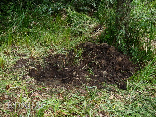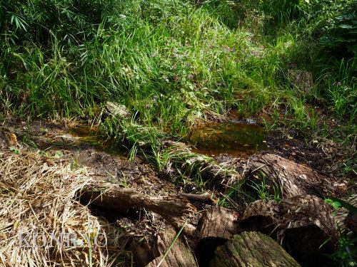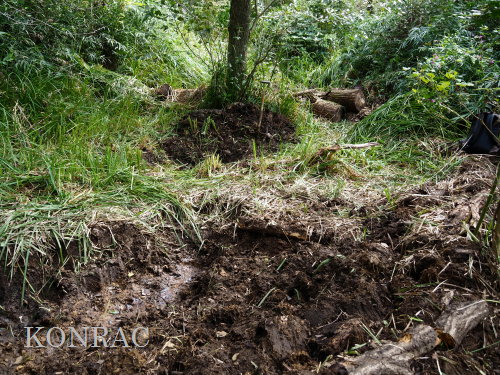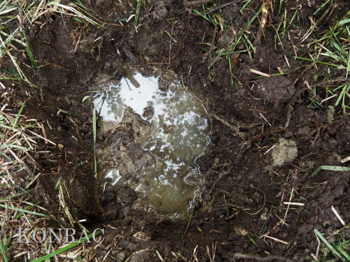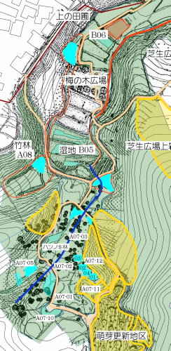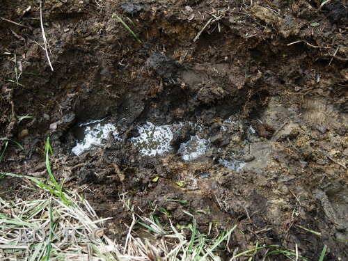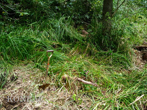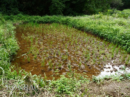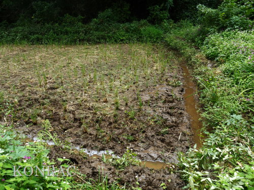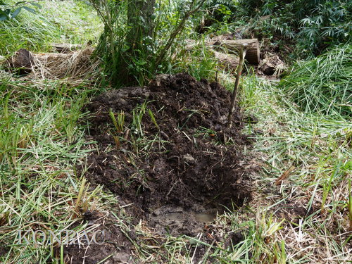 | 上の田圃、ハンノキ林の水辺保全 日 時)10月7日(火) 8:40〜12:00 晴 場 所)生田緑地 上の田圃(B06)、ハンノキ林(A07-03) 活動者)岩田臣生   10/5(日)の里山の自然学校<脱穀>でオダ場に降りた時に、上の田圃(B06)を観察したら、水が涸れたままになっていました。 そのため、田圃の状態を調べて、湛水させるための活動を行っておかなければならないと思いました。 そこで、この日は、ハンノキ林の水辺再生活動の前に、上の田圃の下の段に水を入れるための活動を行っておくことにしました。 梅ノ木広場には、コブナグサが開花していました。   上の田圃 私たちの田圃は、生きもののための田圃なので、基本的には、常に水がある池でなければならないと考えています。 今夏は湧水量が極めて少なかったため、谷戸の各所で水涸れが起こりました。 上の田圃も導入している水量が少なくなって、湛水が困難になったため、下の段の湛水は諦めていました。 今年は、7/22(火)に、上の段の土嚢を1枚外して、下の段にも、少し、水を入れるようにしていましたが、下の段に水面が広がることはありませんでした。 9/28(日)の稲刈りの後は、産卵に訪れるトンボのために、上の段だけでも湛水しておきたいと考えて、一旦下げていた土嚢堰を元の高さに戻しておきました。 1週間後の10/5(日)の脱穀の日には、上の段は湛水していましたが、この堰を越える水は少なく、下の段には、水面は広がりませんでした。 流量が少なくても、時間をかければ、水面が広がるかも知れないと思いましたが、全く変わりませんでした。 流れ出ている水の先端辺りに水が染み込む水漏れ穴があるのかも知れないと思って、上の田圃の下の段に入って、水漏れ穴を探しましたが、見つかりませんでした。 そこで、田圃の外周の溝を掘ってみることにしました。 掘った溝には、浅いものの、水が流れてきました。 そこで、木道側の半分、コの字状の水路を掘ったところで、この日の田圃の活動は止めることにしました。 スコップで田圃の周囲の溝を掘るのは腰の負担が大きいのです。 雨が降って、田圃に水面が広がってくれることを祈って、この日の田圃活動は終えることにしました。 10:07 暑さ指数 19.4℃、周囲温度 23.0℃、湿度 66.9%  上の田圃の下の段に掘った溝  上の田圃の下の段  上の田圃の上の段 ハンノキ林 生田緑地のハンノキ林はゲンジボタルの棲息地であるため、4〜8月は立ち入らないようにして、大事にしてきたことが禍したようです。 水流の泥上げが不十分で、泥が年々蓄積されてしまい、陸地化が進んでいたことが分かりました。 そのため、秋〜冬は、水流に溜まった土砂を取り出して、水辺を再生する活動を第一課題とすることにしました。 どのように展開すれば良いかは、思案中です。 この日は、ハンノキ林の(A07-02)の支谷戸の(地点01)と(地点02)の間の(地点04)の土砂を掘り出してみることにしました。 まず、ミヤマシラスゲなどの草刈りを行いました。   それから、そこに、直径60〜70cmの穴を掘りました。 倒木は退かして、ハンノキ等の根は伐って、40cm程の深さの穴を掘りました。 30cmを越えると、崩れた飯室層と思われる土に砂が混ざったような灰色の土となり、僅かに、周囲から水が染み出してきました。       この(地点04)の上側のハンノキの上側の水溜まり(地点01)の水は減っていました。   下側の(地点02)に掘った穴の水は消えていましたので、そこを少し大きく掘って、水の染み出しを確認しました。     (地点04)の穴は、もっと大きく掘らなければならないと思いましたが、手指にできたマメが破れ、腰も悲鳴を上げ始めましたので、この日の活動は終了することにしました。 辺りには、ヤブマメやカシワバハグマが咲き、コバノガマズミが赤い実をつけていました。  ヤブマメ  カシワバハグマ  コバノガマズミ ハンノキ林のノダケも咲いていました。   |