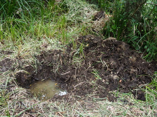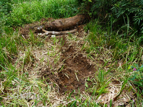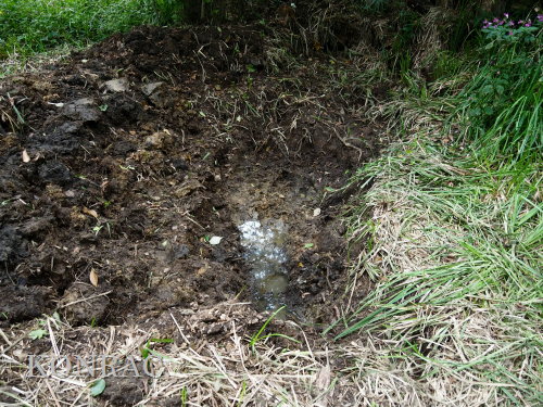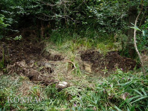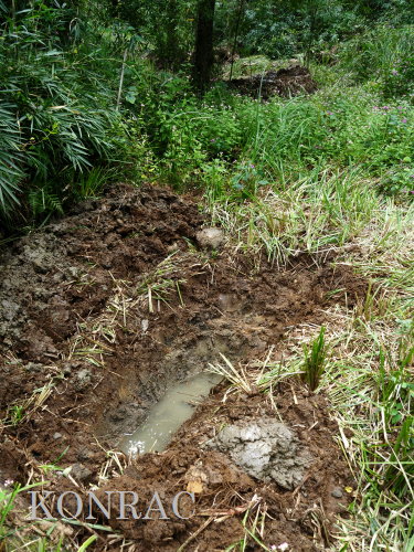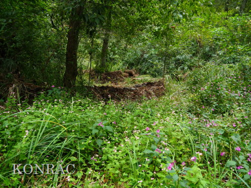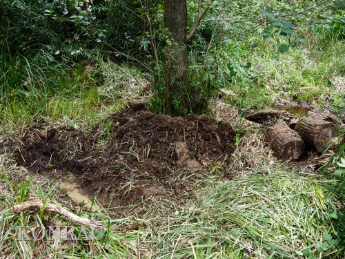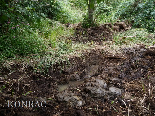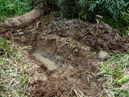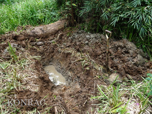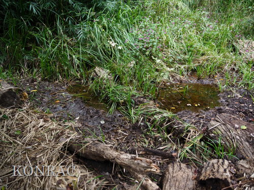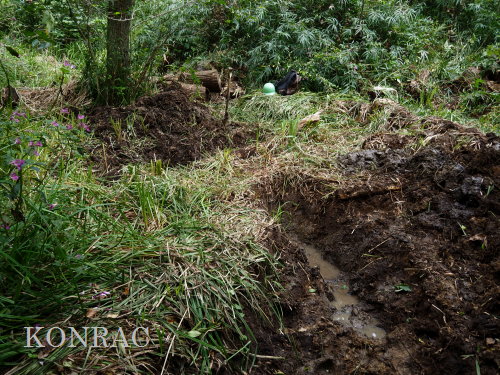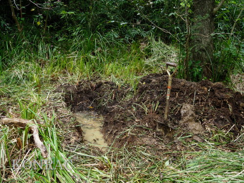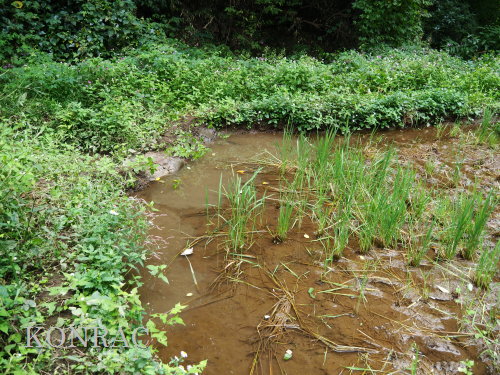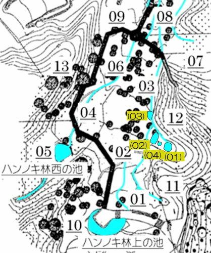 | ハンノキ林の水辺再生 日 時)10月9日(木) 9:00〜12:00 曇 風 場 所)生田緑地 上の田圃(B06)、ハンノキ林(A07-03) 活動者)岩田臣生 上の田圃 前回10/7(火)の結果を確認するために、上の田圃に行きました。 導水路には少ないながら水があったのですが、上の田圃の堰を越える水は無く、下の段の外周の溝は水涸れしていました。 上の段の堰の近くあった水漏れ穴は塞ぎました。   田圃の上側の水路からの点検が必要な状態ですが、水路はミゾソバに完全に覆われていました。 上の段には少ないながら、水があるので、田圃の改修は後日にして、この日は、ハンノキ林の水辺再生を行うことにしました。 田圃の隅に、マユタテアカネがいました。   ハンノキ林   一昨日、10/7(火)に掘った地点04の穴の状態を確認しました。 穴の底に僅かに染み出していた水が少し溜まっていました。   地点02の穴にも、少しながら水がありました。   地点01の水は、減少したままの状態でした。   そこで、地点04の穴を2倍に広げました。 周囲から染み出す水の量がt増えたとは思えませんでしたが、水面は広がりました。   次に、地点02の水溜まりを広げました。   それから、地点03の状態を確認しました。 9/23(火)に掘り始めた時には僅かにあった水が完全に消えていました。   地点03から地点02を見ると、この間にも1点、穴を掘った方が良さそうです。   地点03に考えていた堰の上側の土掘りを行いました。 崩れた飯室層の様な緑灰色の粘土の層になっても、水の気配がありませんでした。 更に掘って、地上から50cmを越えた辺りから、水が染み出し始めました。 最初に、堰づくりのために置いた土嚢は浅すぎたことが分かりました。 こんなに大量の土が積もっていたのかと驚きました。     休憩してから、地点02、04に戻って、少し手を入れました。       地点03に戻って、少し手を入れて、この日の活動を終えることにしました。   水辺に戻したい場所には、ツリフネソウやミゾソバが咲き乱れていますが、これらを刈って、地表 30〜50cmの土を取り除かなければならないことが分かりました。 最近の活動で掘っている点的な穴を繋ぐ線が、つくろうとしている水辺の主要な流路にできると思っています。 |