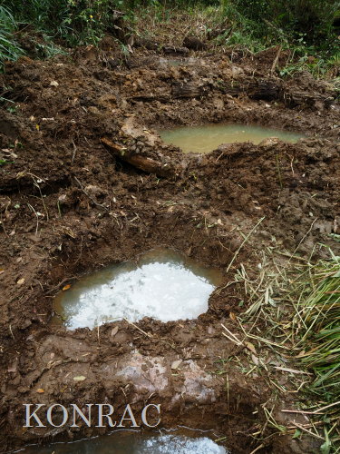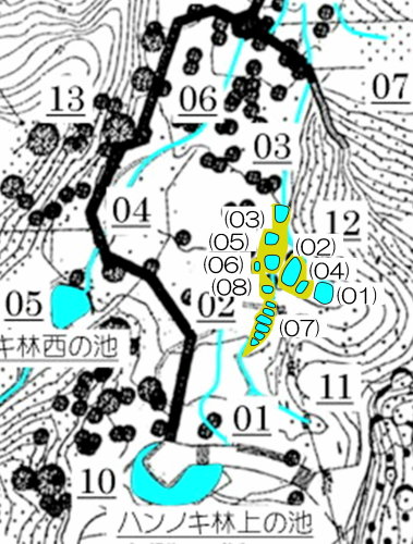 | ハンノキ林の水辺再生 日 時)10月21日(火) 9:00〜12:00 曇 場 所)生田緑地 ハンノキ林(A07-02) 活動者)岩田臣生 当該地区の水辺再生活動を10/18(土)の里山倶楽部でも実施しました。 場所は、ハンノキ林東地区(A07-11)の西側斜面下です。 この場所を連続する水溜まり状の水流とするために、連続する穴(07)を掘りました。 現地に着いて、この場所の状態を調べました。 残念ながら、水は流れていませんでした。 しかし、里山倶楽部のみんなが掘った穴は、どれも深かったのですが、どの穴にもたっぷりと水が溜まっていました。     流れ出してはいませんでしたが、流れて来る、地下では流れて来ているかも知れないと思われる場所(08)辺りに、水溜まり穴を掘りました。 やたらと樹木の根が張っていて、桑切鎌で根を伐りながらの穴掘りでした。 50〜60cm掘ったら、穴の底に、水が見え始めました。 この穴の傍にあったハンノキの根元に、度々水が流れましたとでも言いたげな痕跡がありました。 そこで、その痕跡の少し下側の水が流れているかも知れないと思われた場所にも穴を掘ってみましたが、浅い所から黄白色の飯室層かと思われる土が続きました。 この状態の記録を撮影しようとカメラを出しましたが、バッテリー残量が無くなっていて、撮影できなくなっていました。 それならスマホで撮ろうと思ったのですが、スマホを持ってくきていませんでした。 活動した記録が撮れないことになったら、活動意欲が湧いてこなくなりました。   03、05、06の辺りの平坦な場所の水溜まり穴の水位に変化は感じられませんでした。 02の水溜まり穴を少し広げてみましたが、水深に変化があったわけではないので止めました。 湧水量が増えていると感じさせてくれる現象が見つかりません。 |