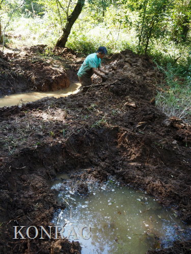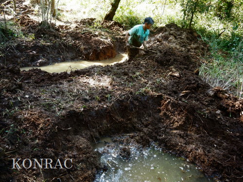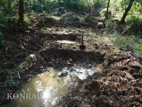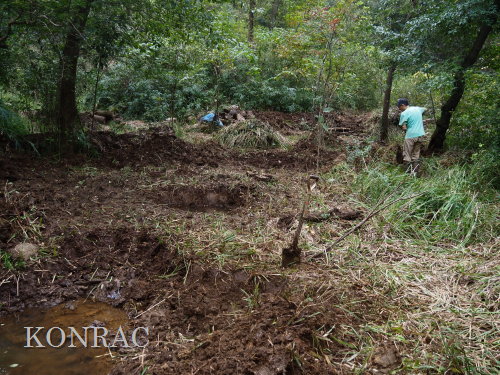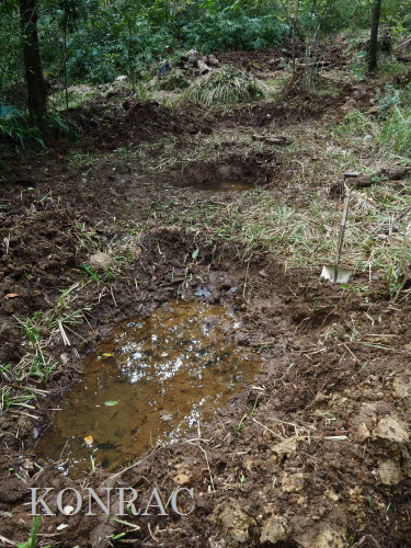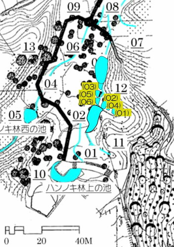 ハンノキ林の水辺再生 日 時)10月30日(木) 9:00〜12:00 曇後晴 場 所)生田緑地 ハンノキ林(A07-02) 活動者)岩田臣生、田村成美 今回も、ハンノキ林東地区の斜面下の水辺を再生する活動です。 今までに、ハンノキ林東地区(A07-11)と(A07-12)の間の谷が、ハンノキ林(A07-02)に突き当たる所に、水溜まり06、05、03を掘ってきましたが、 この3つの水溜まりを広げて、相互の間隔を1m程度にしました。 谷戸の水源池として位置付けて、基底部の飯室層の上面をつたって周囲に染み出してくる湧水を集めて、そこから斜面下を流れる水流をつくりたいと考えています。 今までに掘ってきた水溜まり穴には、周囲から染み出してきた水が溜まっていますが、水が出てくる地層は、穴の全周囲のどこも同じなので、染み込んで、出てもいます。 そのために、穴の中の水位は殆ど変化しません。 今後は、これらの穴から、水がオーバーフロウするように手を入れていきたいと思います。 谷幅が一番狭くなっている03において、全ての水を止める堰をつくることを考えなければならないと思います。 最初に発想して、土嚢を並べて、03を掘り始めたのですが、考えていた水底の高さが浅すぎていて役に立ちませんでした。 基底部の飯室層を確認できれば、そこから土嚢を積んでいくのが確実だと思いますが、砂礫と粘土の混在している地層の厚さが分かりません。 水溜まり穴03には水が溜まっていますが、その底を更に掘って、底土の状態を調べて、粘土だけになったら、土嚢を積んでおいて、時間が経ってから、 水深が深くなるかをみることになると思います。 水深が深くなって、土嚢堰を越えるようであれば、これを補強して堰堤として仕上げるつもりです。