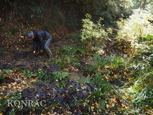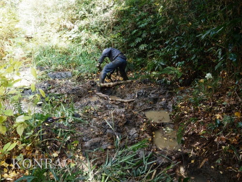 野鳥の森の水流の水辺保全 日 時)11月27日(木) 9:00〜12:00 曇 場 所)生田緑地 野鳥の森の水辺(B01) 活動者)岩田臣生、伊澤高行 この日は、野鳥の森の水辺(B01)の泥上げを行いました。