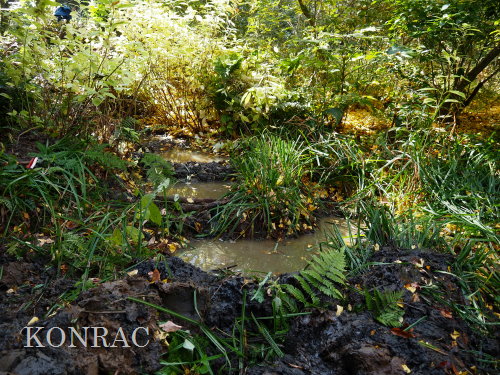 (上図)11/27(木)の活動場所図 久し振りの野鳥の森の水流は、水面が消えて、湿った土面が続いていました。 しかし、スコップを入れたら、柔らかい土で、掘った穴には直ぐに、水が湧いてきました。 ハンノキ林の現状とは雲泥の差があるのに驚きました。 20cm程度の深さの水溜まり穴が簡単に掘れて、次の水溜まり穴を掘っているうちに、開放水面が広がっていくのです。 ただ、スコップを使う穴掘りは腰の負担が大きく、毎回行ってきた範囲だと思うのですが、1回で完了することはできませんでした。