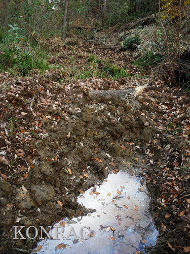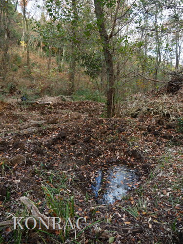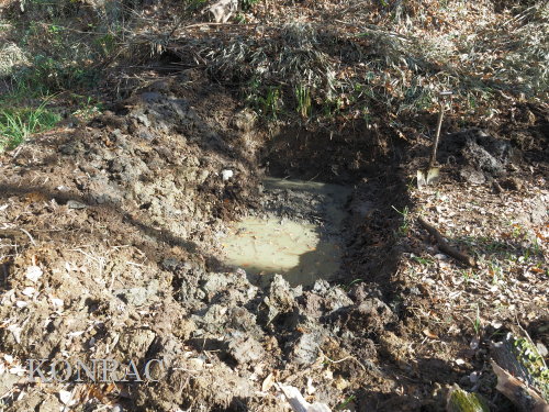 この少し下側の水溜まり穴02は、谷を横断する形で水溜まり穴を掘るつもりで、9/25(木)に掘ったのですが、谷を横断しきれていません。 水は涸れずに、小さな池の状態が続いています。