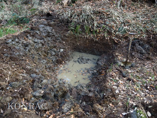 この日の課題は、斜面の裾部には水が絞り出されていると考えて、斜面の裾部を削って、水溜まり穴を繋げることにしました。