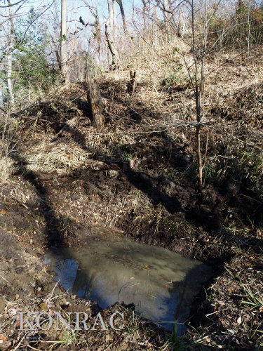 この水溜まり穴は、水が涸れることなく、水深の変化が一番少ないと思いましたので、 源頭部の水源池としては、この水溜まり穴02、04の場所が良いのではないかと思いました。 そこで、今回は、この二つの水溜まり穴を大きくしてみることにしました。 ただ、両斜面の裾部には大径木の伐採材が積んであったので、裾部まで削って掘ることは気が進みません。 02と04を合わせて、一つにすることも考えましたが、現状では高さが少し異なりましたので、まずは二つの池にすることにしました。 かなり大きくはなったと思いますが、水底は粘土質になっていないので、もう少し掘れると思いましたが、今回の活動はここまでとしました。 気温 10.4℃、湿度 41.3%