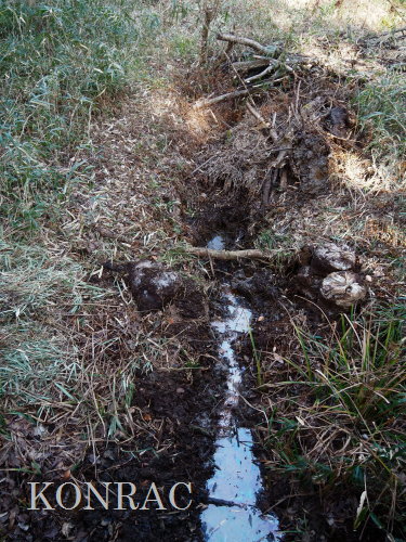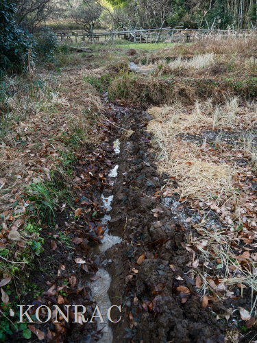 木道下を抜けて来る導水路の水の流れが気になったので、この田圃上の水路の泥上げを行いました。