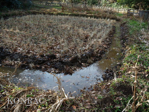 この日の上の田圃の手入れは、ここまでとして、湿地地区(B05)の状態を観察することにしました。 ハンノキ林から入る水路に落葉などが溜まっていたので、泥上げをしました。