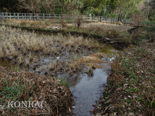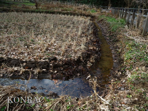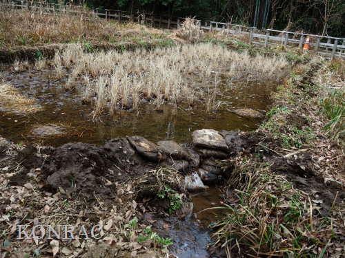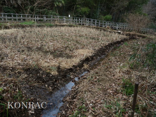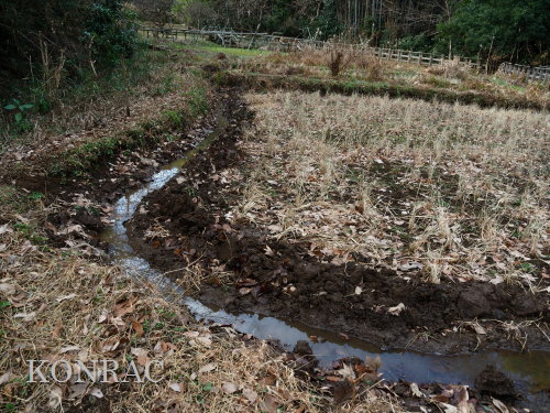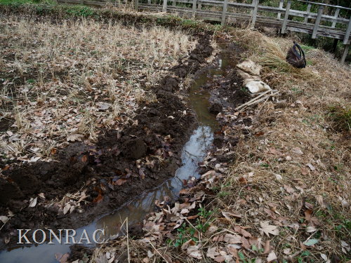 できるだけのことは行ったつもりですので、上の田圃の活動は終わりにして、湿地地区に移動しました。 (ロ)湿地地区 この日はジョレンを持って来たので、ハンノキ林からの導水路から始めて、1、2段目の水路の泥上げを行いました。 竹林との間の水流について観察し、湿地地区1段目、2段目、竹林下水流、谷戸左岸水流の結節方法について考えました。 ホトケドジョウの往来を可能にしなければなりません。