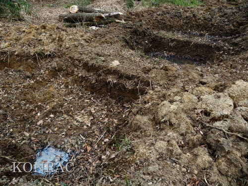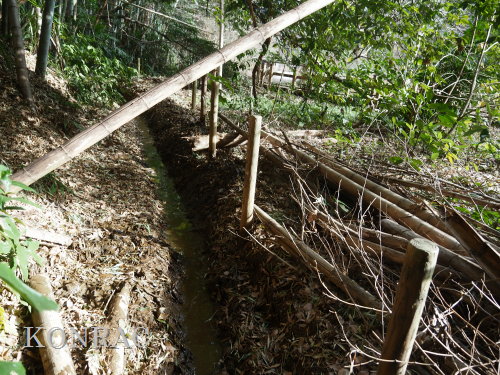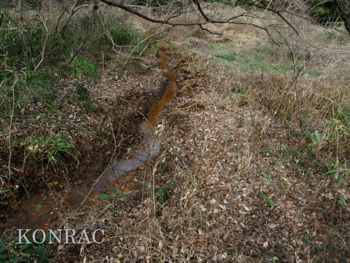 材を取り出した水路を調べましたが、途中に、何処に通じているのか不明の穴が開いていました。 この穴を埋めて、水漏れしないようにできるかは分かりません。 ただ.、ハンノキ林上の池からの水は、水路を舐めるように流れて、その穴に達していました。