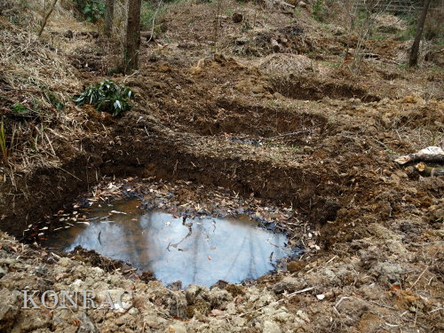 水辺再生のために掘った水溜まり穴の水は減少して、少なくなっており、干上がっていた穴もありました。