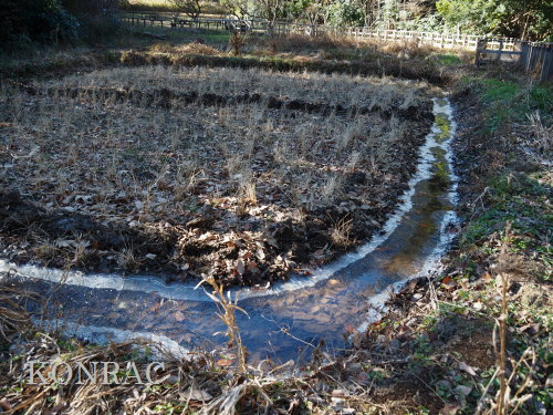 (上図)活動場所位置図 (イ)上の田圃を湛水させる活動 今日も上の田圃に直行しましたが、下の段に流入させている水は溝の中で、薄氷を張っていました。