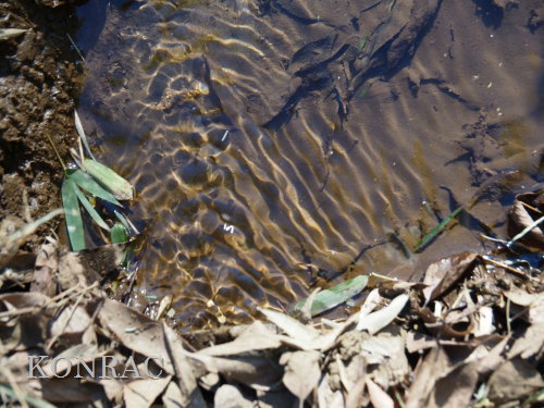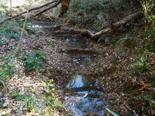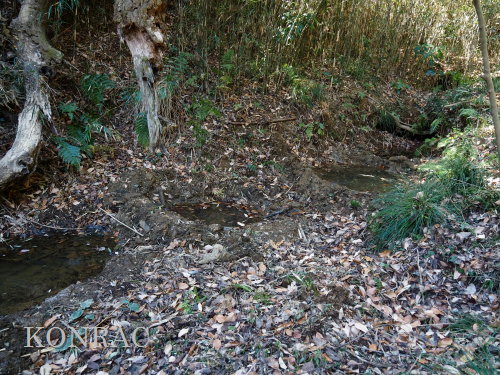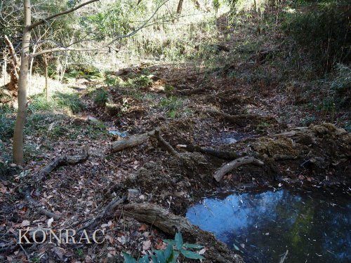 ヤブを無くすと、水流には水底を舐めるように水面が薄く広がっていました。 ここで合流させるのであれば、この部分の水流を浅い階段状にできるかどうかが課題になりそうです。 また、湿地地区3段目から、谷戸左岸水流に、生物の往来が可能な形で水を流すことができるなら、 合流部では、今までと同様の流し方で、谷戸左岸水流としては源頭部として染み出してきた水を流しておけば良いと思います。