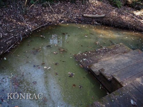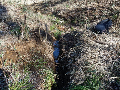 (ロ)竹林下辺りの谷戸左岸水流(湿地地区) 今までは、竹林と湿地地区の間の谷戸左岸水流の上端部は、湿地地区1段目からの水と竹林下谷戸からの水を、湿地地区2段目に入れるための場として管理していました。 これからは、谷戸左岸水流を上の田圃に水を供給するための水流として、意識的に保全することを考えました。 その保全管理の基本は、ホトケドジョウやオニヤンマなどの生物が、谷戸の水辺を自由に往来できることだと考えました。 現状は、竹林下の園路の路面が崩れて、柵が水流内に倒れ込んで、伐採材などを捨ててあったり、ヤブになったりしていました。 今回は、この合流部のアズマネザサやシダを刈って、除けられる材は除けて、水流の状態を確認できるようにしました。