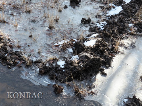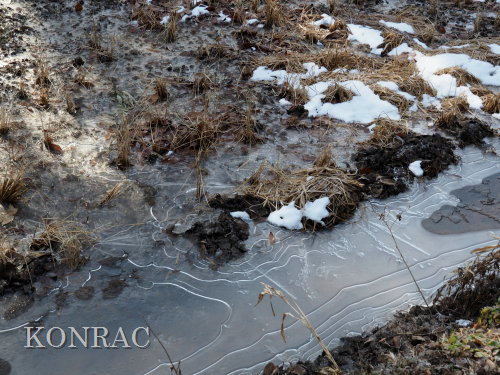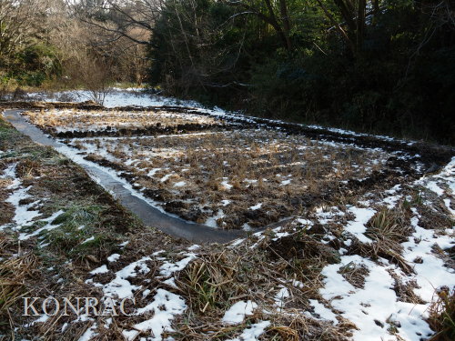 上の田圃に積もった雪は殆ど解けていましたが、田圃の土の上に、薄く氷が張っている所がありました。